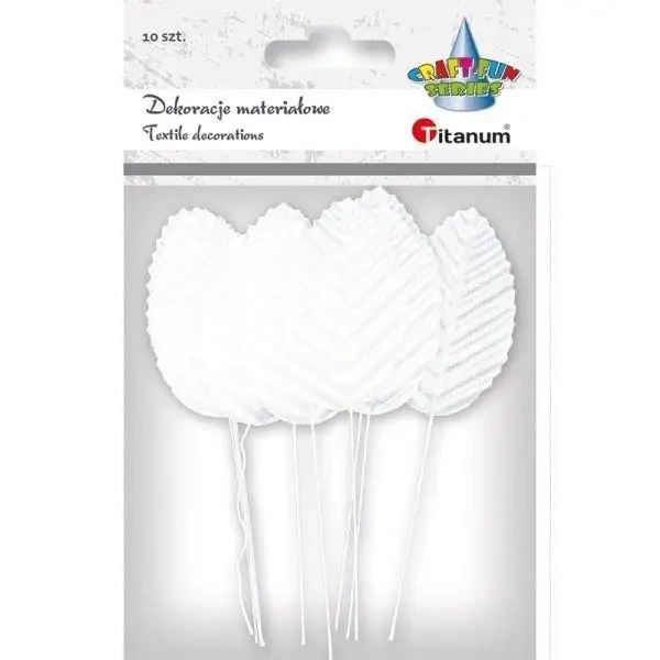 Chcesz dodać swoim dekoracjom delikatny i elegancki akcent? Liście z materiału na druciku, o wymiarach 30x50mm, w liczbie 10 sztuk, dostępne w kolorze białym to to, czego szukasz! Ich delikatna faktura i neutralny kolor stanowić będą piękne uzupełnienie różnorodnych kompozycji.