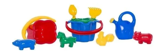 Zestaw Hemar Family składa się z 10 elementów, w tym 2 wiaderka o nazwach "Kogucik" i "Koniczynka", które zapewnią niekończącą się zabawę dla małych miłośników przyrody. W skład kompletu wchodzą także łopatka, grabki, 4 foremki w kształcie zwierzątek oraz konewka "Stokrotka", dzięki którym dzieci mogą wykazać się pomysłowością i troską o własny ogródek.