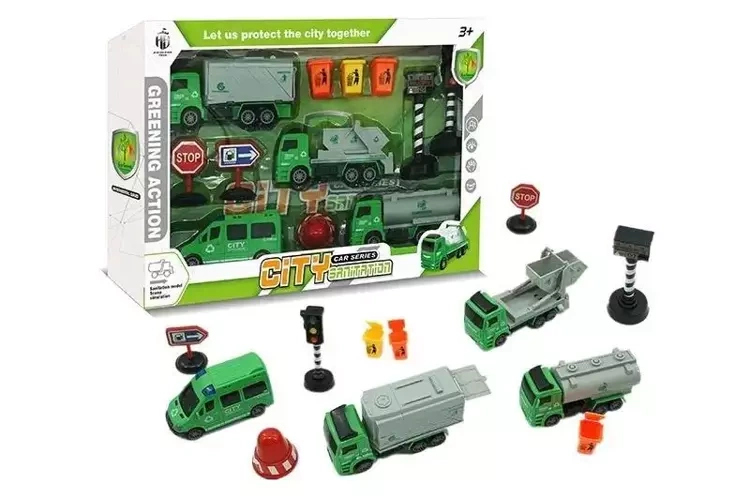 W skład tego kompletu wchodzą: beczkowóz, śmieciarka, auto kontener, auto osobowe, sygnalizacja świetlna, znaki drogowe oraz 3 kosze na śmieci. Zestaw cechuje się ciekawymi funkcjami, takimi jak napęd pull back (pojazd rozpędza się po przyciągnięciu do tyłu), otwierany tył śmieciarki oraz ruchomy kontener. Długość każdego auta wynosi 12 cm.