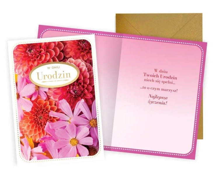 Specyfikacja produktu obejmuje: rozmiar B6, tzn. 16.6 x 11.7 cm po złożeniu, oraz dopasowaną kopertę. Kartkę cechują co najmniej dwa rodzaje efektownych zdobień, takich jak złota, srebrna lub perłowa folia, brokat, tłoczenia. Wnętrze każdej kartki jednolite kolorystycznie, zostało ozdobione starannie dobranymi życzeniami.