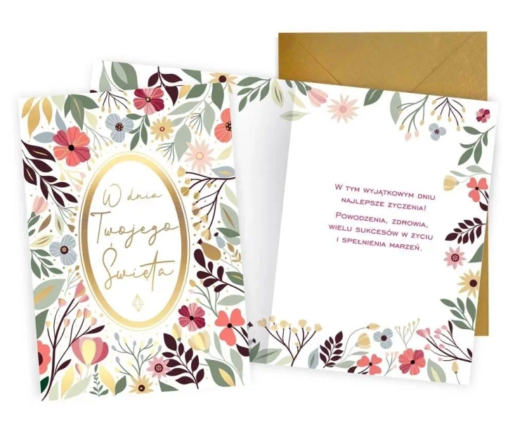 Kartki cechują się unikalnym designem i doskonałą jakością. Ich rozmiar - B6, 16.6 x 11.7 cm po złożeniu - to optymalny format, doskonały zarówno do wręczenia bezpośredniego, jak i wysłania pocztą. Wykończenia kartki - złota, srebrna lub perłowa folia, brokat, tłoczenia - dodają elegancji i prestiżu. To więcej niż tylko kartka - to piękna pamiątka na lata.