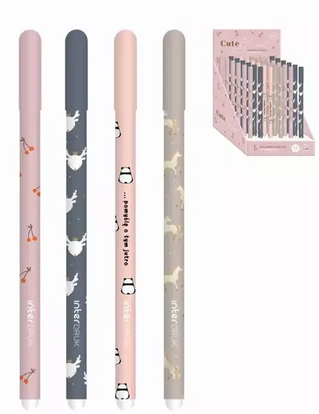 Co wyróżnia te długopisy to zakończenie gumką, która staje się niezastąpioną pomocą w szybkim i estetycznym poprawianiu tekstu. Pozwala na usuwanie błędów bez potrzeby używania korektora lub przekreślania - to znacząco poprawia komfort pracy.Cztery dziewczęce wzory