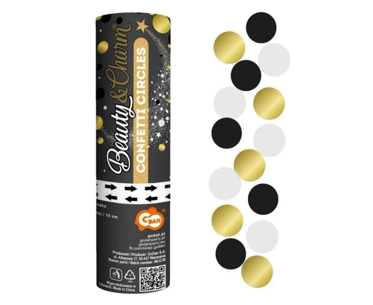 Konfetti pneumatyczne. Kółeczka (czarne, złote, białe), 15 cm - Godan