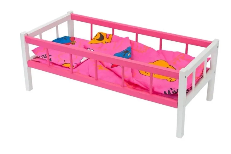 Łóżeczko dla lalek w jaskrawym różowym kolorze wyróżnia się prostotą oraz trwałością swojej konstrukcji. Wykonane jest z ekologicznego drewna, dzięki czemu jest bezpieczne dla dzieci i przyjazne dla środowiska. W zestawie z łóżeczkiem znajduje się także komplet pościeli, który dodatkowo uatrakcyjnia zabawkę.