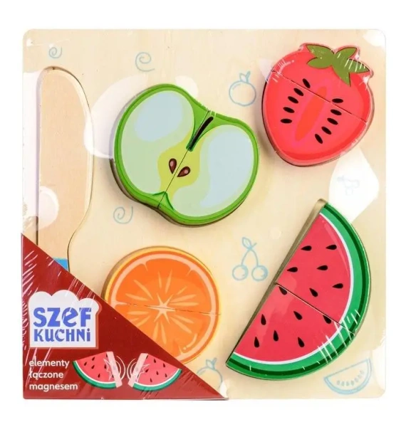 Wszystkie elementy zestawu, łącznie z używaną farbą, są bezpieczne dla dzieci. Poszczególne części składające się na owoce i warzywa połączone są za pomocą magnesów, co ułatwia zabawę w krojenie i łączenie ich z powrotem.