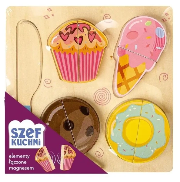 Zaawansowany zestaw "Szef kuchni" stymuluje wyobraźnię, rozwija kreatywność oraz umiejętności manualne Twojego dziecka. Zestaw ten pozwala na odkrywanie barwnego świata przekąsek, zachęcając dzieci do poznawania sztuki gotowania. Wykonany z drewna, komplet jest pokryty bezpieczną dla dzieci farbą. Poszczególne elementy łączone są za pomocą magnesów.
