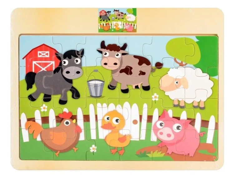 Prezentujemy drewnianą układankę dla dzieci, która doskonale wspomaga rozwój spostrzegawczości, wyobraźni oraz koordynacji wzrokowo-ruchowej. Składa się ona z 24 elementów wraz z zilustrowanym obrazkiem, przedstawiającym sympatyczne zwierzęta domowe. Dzięki temu zabawka gwarantuje mnóstwo radości i pozytywnych emocji podczas zabawy.