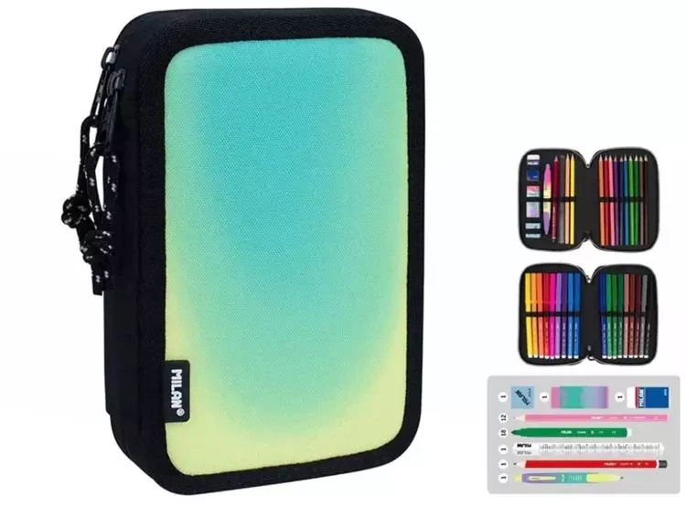 W środku piórnika znajdują się między innymi kredki MILAN, które zostały wyprodukowane wyłącznie z drewna pochodzącego z ekologicznych plantacji, które nie wykorzystują drewna z lasów deszczowych. Szczególny design kredek, oparty na trójkątnej formie, jest ergonomiczny i dziecko bez problemu może go trzymać. Rysik kredek przez całą swoją długość jest przytwierdzony do drewna, co zapobiega jego łamaniu.