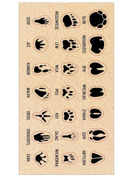 Unikatowe naklejki z motywami śladów zwierząt stworzone, by ozdobić zeszyty, albumy, listy czy kartki pocztowe. Set składa się z 21 różnorodnych naklejek, które zawierają nie tylko odciski łap różnych zwierząt, ale także opisy poszczególnych gatunków. Wzbogacony w takie elementy edukacyjne zestaw jest szczególnie polecany dla szkół.