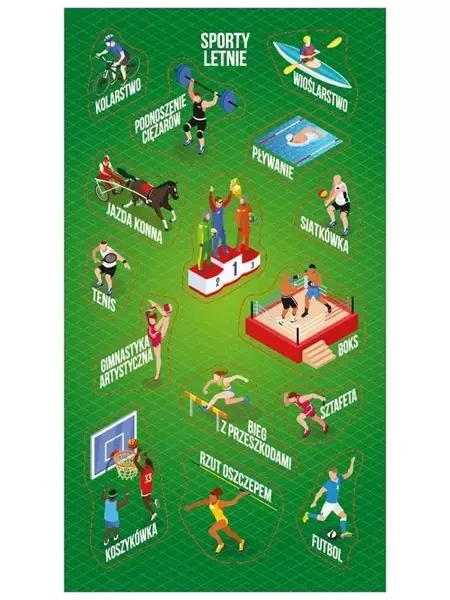 Komplet autorskich naklejek z motywem letnich dyscyplin sportowych, doskonały do personalizowania zeszytów, albumów, listów czy pocztówek. Komplet 15 sztuk z różnymi sportami i opisami - idealny dla miłośników sportu i aktywności na świeżym powietrzu. Zalecany jako środek do nauki w szkołach.