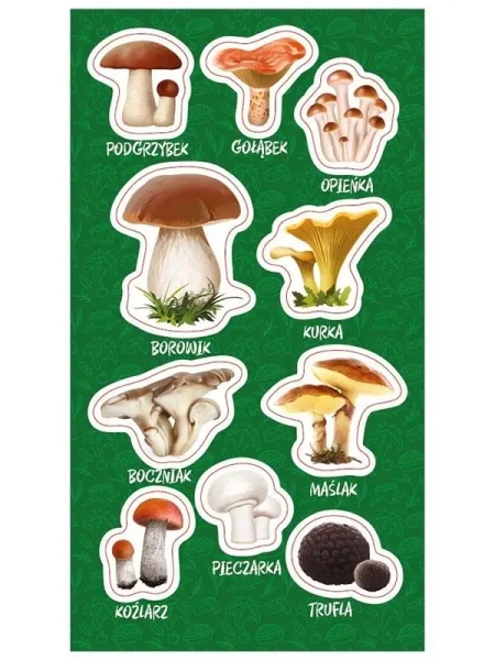 Paket ozdób w postaci naklejek, idealny do dekoracji takich rzeczy jak zeszyty, albumy, listy czy choćby pocztówki. To aż 10 akcesoriów przedstawiających jadalne grzyby, które są dodatkowo opisane. Zdecydowanie zalecane do zastosowania w szkołach.