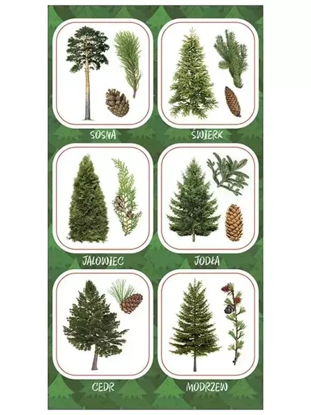 Prezentowany zestaw to idealne narzędzie do dekorowania zeszytów, albumów, listów czy pocztówek. W pakiecie otrzymujesz 6 naklejek przedstawiających nie tylko drzewa iglaste, ale również ich owoce. Produkt ten jest szczególnie polecany dla szkół - może być wykorzystany do zajęć edukacyjnych związanych z przyrodą bądź jako element ozdobny przy różnego typu pracach plastycznych.