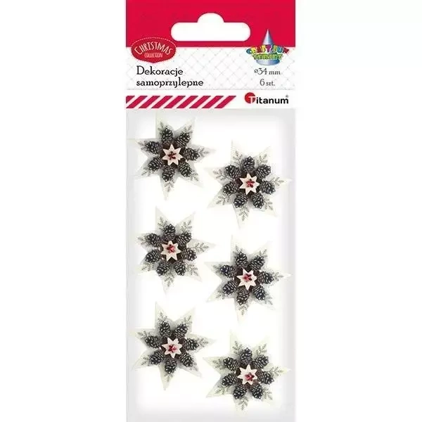 Samoprzylepne dekoracje 3D z papieru i folii przedstawiające świąteczne gwiazdy z szyszkami o średnicy 34mm - zestaw 6 szt.