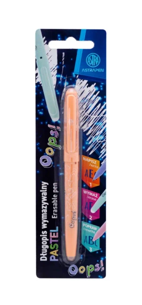 Astrapen Oops! to długopisy ścieralne, które zrewolucjonizowały współczesny styl pisania. Wyposażone w niezwykły wkład z tuszem, umożliwiają usunięcie napisanego tekstu. Element ten umożliwia wymazanie napisanej treści, dzięki specyficznym gumkom umieszczonym na końcu długopisu. Ergonomiczny design zapewnia niezrównaną łatwość pisania. Baw się pisząc i ścierając!