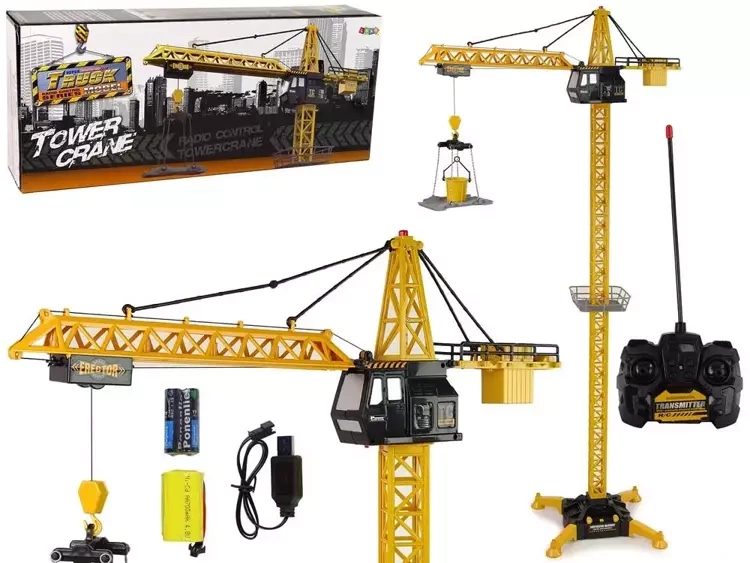 Dźwig zdalnie sterowany wykonany jest z łatwych do złożenia elementów, co pozwala na szybki montaż. W zestawie znajdują się również akcesoria, takie jak platforma kabiny, hak i przeciwwaga, które uzupełniają wyposażenie maszyny.