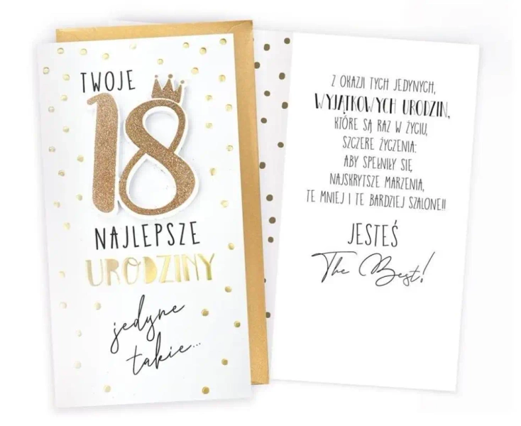 Otwierając kartkę, odkryjecie Państwo kolorowe wnętrze ozdobione delikatną grafiką. Jest ono idealnym tłem dla napisanych w środku życzeń, które są zawsze wyjątkowe i dopasowane do okoliczności. Bez względu na to, czy szukasz kartki na 18 urodziny, czy na inną ważną rocznicę, z naszą ofertą na pewno trafisz w dziesiątkę.