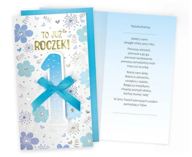 Karnet Urodziny Roczek niebieskie kwiatki - Kukartka
