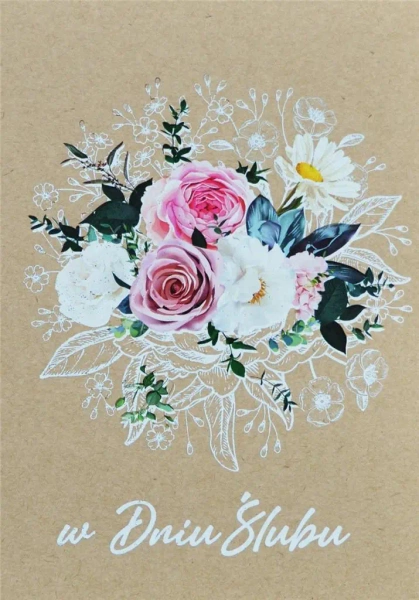 Prezentowany produkt to kartka okolicznościowa o formacie B6 idealna na ślub. Wykonana jest z ekskluzywnego papieru, co świadczy o jej wysokiej jakości. Efekt luksusu potęgują dodatkowo wypukłe złocenia oraz tłoczenia 3D, które nadają jej przestrzennego charakteru. W środku kartki znajdują się już gotowe życzenia, dzięki czemu nie musisz martwić się o odpowiednie sformułowanie.