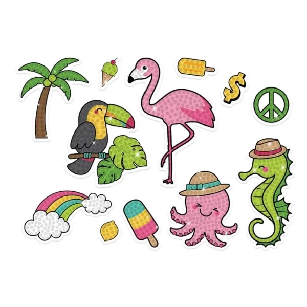 Zestawestaw „Egzotyczne Wakacje” to 12 przyciągających wzrokiem naklejek wykonanych z przezroczystej, kolorowej folii, które dziecko może dekorować za pomocą kolorowych kryształków. Niewielkie rozmiary naklejek to bez wątpienia duży plus. Każda tylko czeka na to, aby dziecko ją starannie wykleiło, zapewniając tym samym sporą dawkę dobrej zabawy przy wykorzystaniu haftu diamentowego.