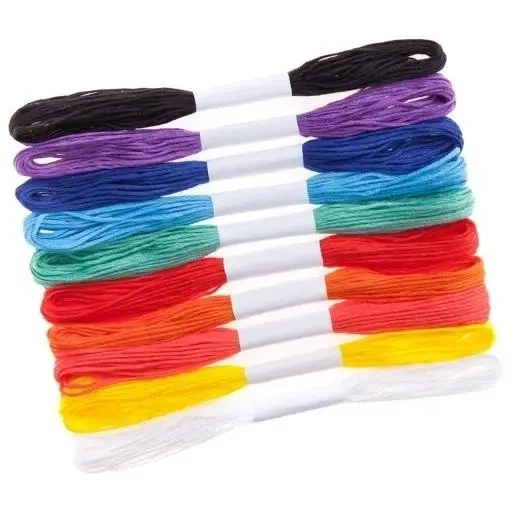 W skład zestawu wchodzi 10 motków muliny w różnych, podstawowych kolorach, takich jak fioletowy, żółty, różowy, biały, pomarańczowy, jasny niebieski, ciemny niebieski, zielony, czarny oraz czerwony.