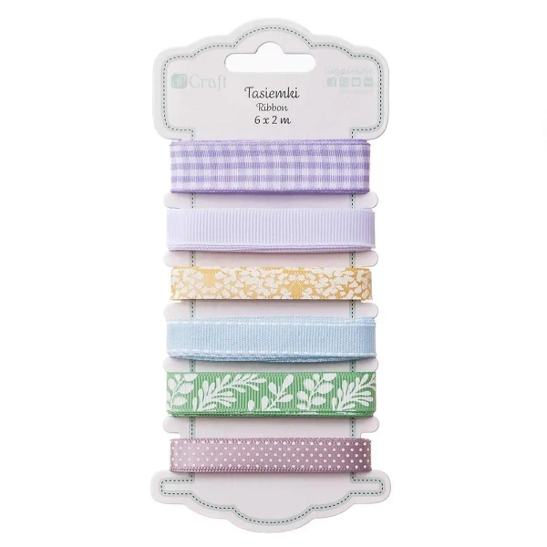 Zestaw zawiera 6 rolek tasiemek o długości 2 m każda, co pozwoli na wiele zastosowań. Paleta kolorystyczna obejmuje biały, fiolet, niebieski, zielony i brązowy, zachowując jednak ogólną harmonię kolorystyczną i łącząc je w jednym, spójnym stylu.