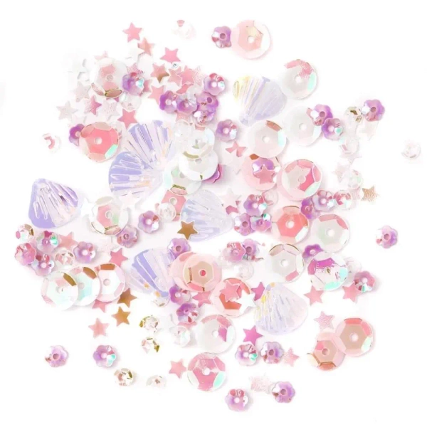 Wyjątkowa kompozycja mieszanki opalizujących cekinów "Unicorn" fascynuje swą różnorodnością kształtów i barw. Ten jednorożcowy mix zawiera aż sześć różnych typów cekinów. Przeglądając zawartość zestawu, odnajdziesz tradycyjne, okrągłe cekiny (w dwóch wielkościach i trzech wersjach kolorystycznych), muszelki, drobne kwiatki i gwiazdeczki. Cekiny z "Unicorn" mixu charakteryzują się opalizującymi odcieniami w różnych tonacjach różu.