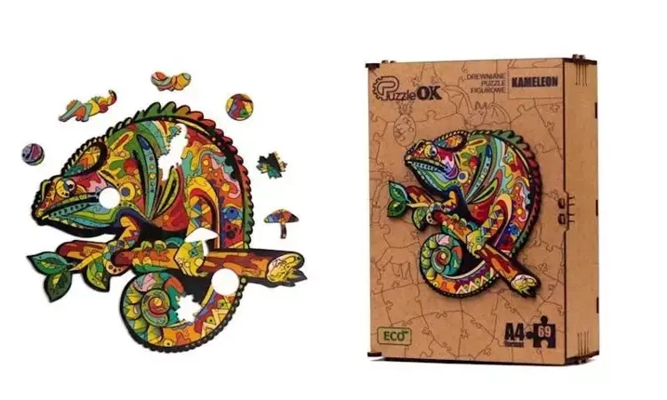 Drewniane puzzle eko w kształcie kameleona to idealne rozwiązanie dla miłośników zwierząt i ekologicznych produktów. Wyróżnij się na tle klasycznych puzzli, wybierając ten niebanalny sposób na spędzenie czasu!