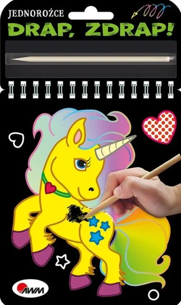 Ta niepowtarzalna książeczka ZDRAPYWANKA została stworzona z myślą o małych artystach. Umożliwia ona tworzenie pięknych i kolorowych obrazków z jednorożcami za pomocą dołączonego DREWNIANEGO RYSIKA. Książka została wykonana z wytrzymałego kartonu i zastosowano w niej farby, które są całkowicie bezpieczne dla dzieci. Zdrapując SPECJALNĄ FARBY, dziecko odkrywa skrywany pod nią obraz jednorożca, dając mu wiele radości. Odkryte obrazki z jednorożcami można następnie zawiesić na ścianie, podarować je jako prezent, albo zebrać do kolekcji.Czytaj, zdrapuj i twórz!