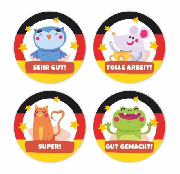 To komplet 48 naklejek, który zawiera radosne ilustracje zwierząt i napisy w języku niemieckim. Jest to idealny sposób na nagrodzenie ucznia!