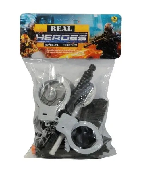 Oto kompletny zestaw policyjny przeznaczony dla dzieci. W skład zestawu wchodzi: pistolet, pałka, kajdanki, gwizdek, granaty oraz odznaka. Zestaw ten idealnie sprawdzi się w domowych zabawach, wprowadzając dzieci w świat awanturników i policjantów! Produkt przeznaczony jest dla dzieci od 3 lat. Zabawka zapakowana jest w przejrzysty worek, a podane wymiary dotyczą produktu w opakowaniu.