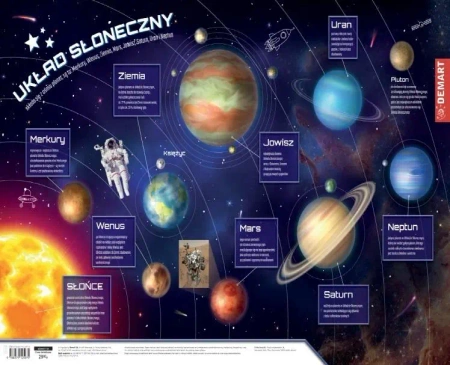 Na podkładce zilustrowano każdą planetę naszego Układu Słonecznego, małe teksty wprowadzają do tematu i inspirują do poszerzenia wiedzy. Dziecko ma okazję, by w przystępny sposób dowiedzieć się, jak skonstruowany jest Układ Słoneczny, jak wyglądają zależności między planetami, dostrzec ich podobieństwa i różnice.