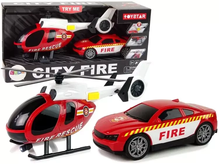 Duży, czerwony helikopter jest wyposażony w ruchome, obrotowe śmigła, które można wprawiać w ruch ręcznie, imitując w ten sposób realistyczny lot. Śmigła mają imponującą rozpiętość - aż 20 cm. Z boku helikoptera znajduje się przycisk, który włącza efekty świetlne i dźwiękowe, sprawiając, że zabawa jest jeszcze bardziej fascynująca! Dźwięk startowania i lotu przyczynia się do realistycznego odbioru zabawki.Auto straż pożarna posiada charakterystyczne naklejki z napisem "fire", przyciemniane szyby i gumowe opony. Na gładkiej powierzchni potrafi osiągnąć imponującą prędkość. Oba pojazdy wykonane są z plastiku, co sprawia, że są lekkie i całkowicie bezpieczne dla dzieci.