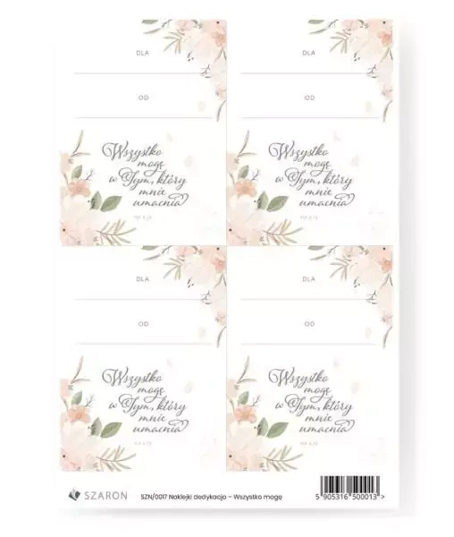 Każdy zestaw zawiera cztery naklejki na jednym arkuszu, które możesz samodzielnie wkleić do swojej książki i wpisać spersonalizowaną dedykację.