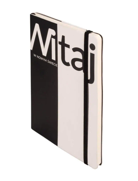 Specyfikacja notesu A5 z kropkami "Witaj" w kolorze czarno-białym od marki Antra