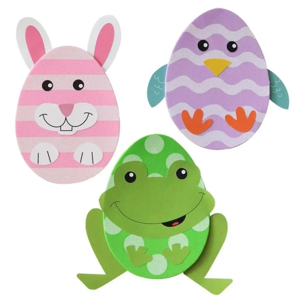 Ten zestaw kreatywny składa się z: - 12 różnorodnych naklejek papierowych, - 3 piankowych jaj o unikalnym, sporym rozmiarze 9 cm, - 3 uroczych wstążek, które pozwolą bez kłopotu utworzyć zawieszki.