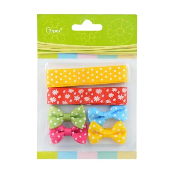 Arpex prezentuje barwny zestaw do ozdób. Wyróżnia się wstążką o wymiarach 1,5x90 cm oraz kokardką o rozmiarach 2x3,5 cm.