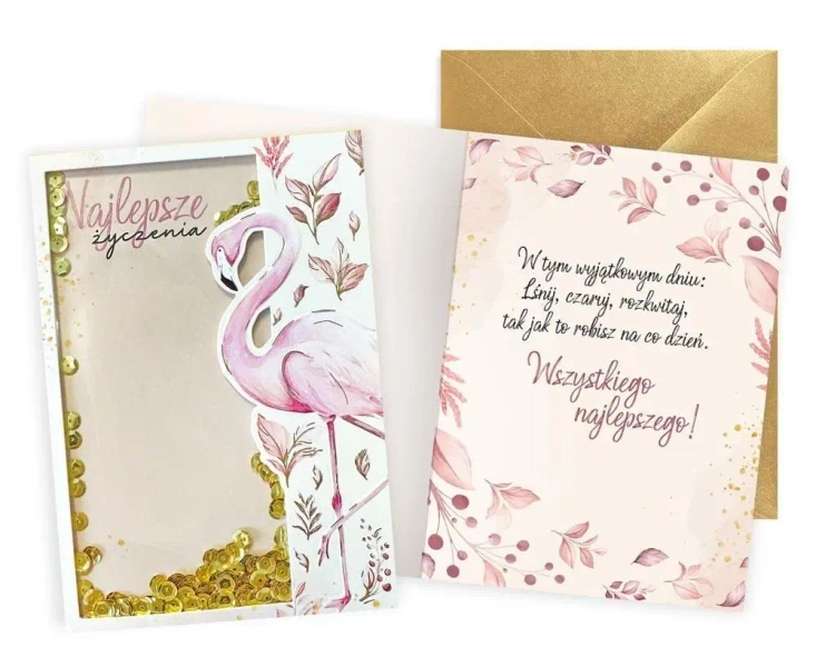 Efektowny i pełen fantazji, karnet z serii Konfetti od Kukartka to prawdziwa dawka kreatywności. Każdy egzemplarz, w zależności od wybranego wzoru, wyróżnia oryginalny, zaskakujący element - przestrzeń wypełnioną kolorowym konfetti. Może to być brokat, złote gwiazdki, efektowne cekiny, a nawet kolorowe kuleczki.