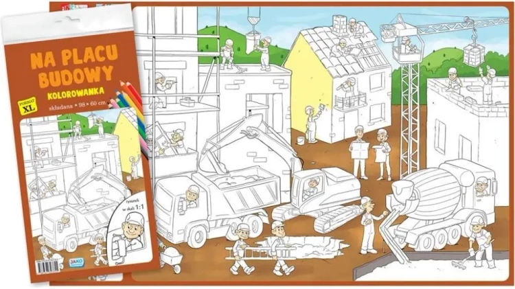 "Na placu budowy" to wielka, złożona kolorowanka, która przenosi dzieci prosto na miejsce pełne konstrukcji i pracowników budowlanych. Wystarczy chwycić kredki - wielostronny obraz o rozmiarach aż 98 x 60 cm czeka na małych artystów. Kolorowanie nie tylko dostarcza doskonałej zabawy, ale także sprzyja rozwoju zdolności manualnych, precyzji oraz koordynacji oko-ręka. Jest to wspaniała forma przygotowania do nauki w szkole i doskonały sposób na relaks i odstresowanie się.