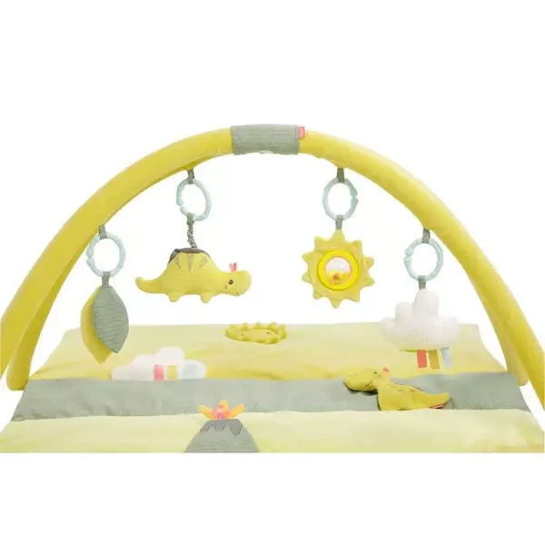 - Duża mata edukacyjna z pięcioma odczepianymi zawieszkami: grzechotką-gwiazdką, lusterkiem, chmurką, listkami z szeleszczącym papierem, wibrującym dinozaurem.
