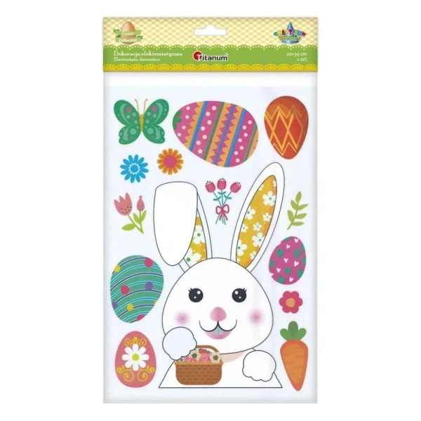 Zestaw wielkanocnych dekoracji elektrostatycznych zawiera różne wzory, dzięki czemu nikogo nie są one monotematyczne. W skład zestawu wchodzą m.in.: zając z koszyczkiem, pisanki, motyl, marchewka i kwiaty.Wielokrotnego użytku