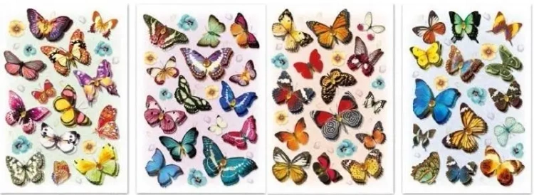 Odkryj piękne, przestrzenne naklejki z motylami. Dostępne są one w czterech różnych wzorach, które są wybierane i wysyłane w sposób losowy.