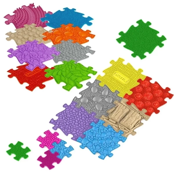 Oba zestawy wzajemnie się dopełniają i tworzą doskonałe narzędzie do różnorodnej stymulacji stóp. Miękkie puzzle doskonale nadają się do delikatnego masażu stóp, pomagając przywrócić komfort i odprężyć zmęczone mięśnie. Z drugiej strony, twarde powierzchnie aktywują nieużywane partie stóp, wzmacniają mięśnie i kostki, a także pomagają rozgrzać stopy poprzez zwiększenie uczucia chodzenia po podłożu.