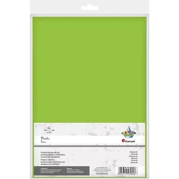 Przedstawiamy zestaw 5 sztuk pianek A4 w modnym kolorze limonkowym. Pianki są idealne do wszelkich prac plastycznych, rękodzieła, ozdabiania projektów DIY czy tworzenia dekoracji. Produkt marki Titanum to świetna propozycja dla osób kreatywnych, zarówno dla dzieci jak i dorosłych.