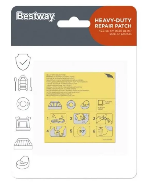 Skutecznie napraw swój nadmuchiwany basen lub inny sprzęt pływający dzięki wodoodpornym łatkom naprawczym Bestway. Niezależnie od tego, czy posiadasz dmuchane zabawki, baseny czy materace, te łatki umożliwią szybką i skuteczną naprawę każdej dziury. Każda z nich jest wyposażona w specjalny klej na powierzchni, który zapewnia szybkie i solidne zamocowanie.