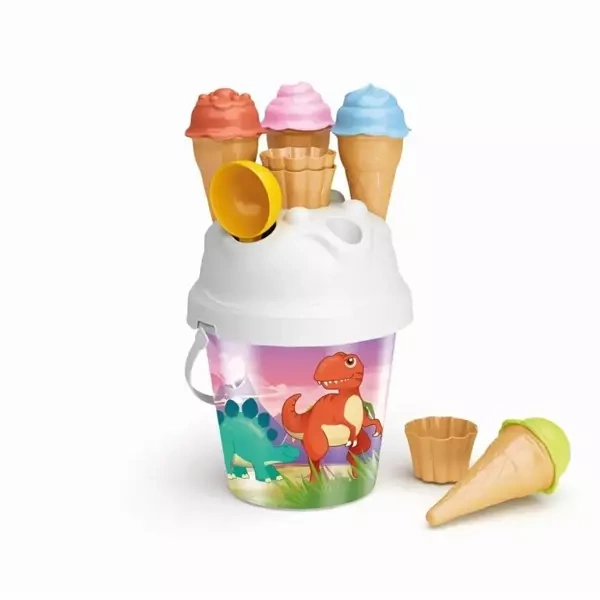 W skład zestawu wchodzi: - Wiaderko z przyciągającym wzrok motywem dinozaurów. Co więcej, jest ono holograficzne, co dodaje mu unikalności. - Pokrywka do wiaderka ze specjalnymi otworami na foremki i łyżkę - idealne do przechowywania i zabrania na plażę. - Cztery foremki w kształcie rożków lodowych. - Trzy foremki w kształcie babeczek. - Łyżka do lodów.Ważne informacje