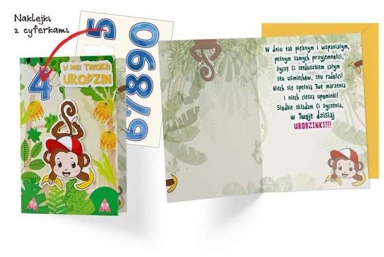 W zestawie z kartką otrzymasz dopasowaną kolorystycznie kopertę oraz naklejki z cyframi.