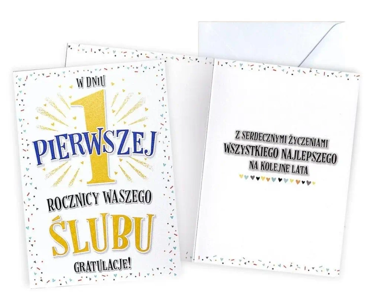 Wewnątrz kartki został umieszczony krótki tekst z życzeniami, a niżej znajduje się miejsce na twoją **osobistą dedykację**. Aby oddać pełnię stylistyki, zestaw zawiera kopertę kolorystycznie zgodną z kartką. Spraw, aby twoje życzenia były niezapomniane z pomocą naszego karnetu rocznicowego.