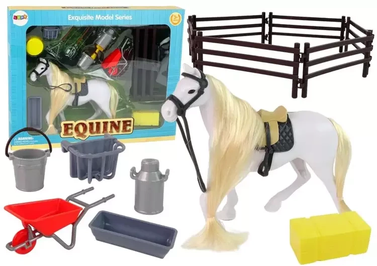 W zestawie znajdziemy konika z długą grzywą, idealną do czesania i plecenia warkoczy oraz liczne akcesoria, takie jak taczka, grabie, widły, a także ich ażurowa zagroda. Dla realistyczności scenki - również wiadra, szczotka i pojemniki na jedzenie i picie. Nie zabrakło też siana i poidła, które sprawią, że zabawa stanie się jeszcze bardziej realistyczna.