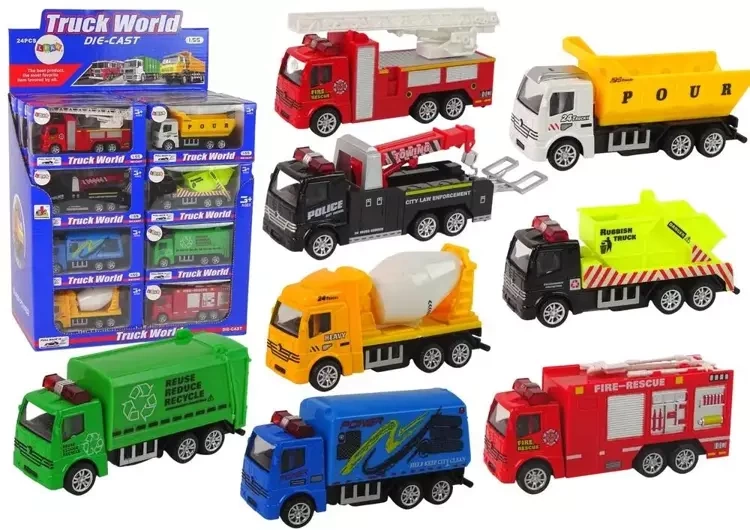 Zestaw składa się z 8 różnych modeli samochodów budowlanych, każdy z nich jest wyjątkowy, posiada własne funkcje oraz charakterystyczny design. Wykonane są w skali 1:55.