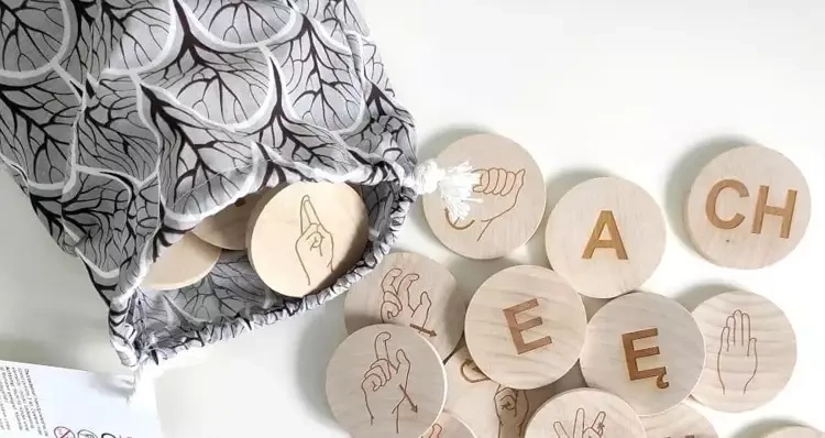 - 36 drewnianych krążków z dwustronnym grawerem (awers z gestem, rewers z literą) - średnica krążka wynosi 6 cm,